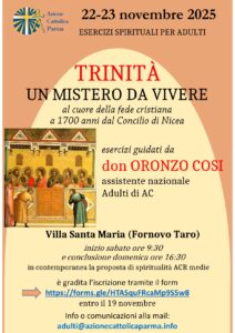 Rieccoci anche quest’anno con la proposta di un fine settimana di esercizi spirituali per adulti, il 22 e 23 novembre a Villa Santa Maria (Fornovo). Gli esercizi saranno guidati da don Oronzo Cosi, assistente nazionale degli adulti di AC.